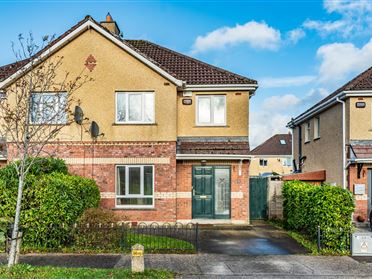 Entrance Hall: 1.9m x 3.8m video intercom, alarm panel, under stair storage, walnut laminate floor, stairs to first floor Kitchen / Dining room 3.3m x 5.48m fully fitted kitchen with integrated Belling oven, hob, space for washing machine & fridge freezer, picture window to front and integrated sssu, walnut laminate floor, breakfast bar Open Plan Lounge: 4.4m x 3.56m walnut laminate floor, feature electric fire with wooden mantlepiece surround, understairs storage, French doors opening to garden, Guest W.C.: walnut laminate floor w.c., pedestal w.h.b, tiled over FIRST FLOOR Landing: Carpeted stairs and landing, window over stairs Bedroom 1 (Master - Front): 4.12m x 4.5m carpet, fitted wardrobes, picture window to rear garden, pull down stira to attic, door to Ensuite: pedestal w.h.b with tiled backsplash, towel rail, w.c., corner shower with enclosed shower tray fully tiled, electric shower, extractor fan and radiator Bathroom: 2.32m x 2.08m Partily tiled, w.c., pedestal w.h.b with tiled backsplash, mirror & light over, bath with electric shower over, towel holder, towel rail, shelving and radiator Bedroom 2 (front): 2.8m x 4.5m Double room, carpet flooring, fitted wardrobes Hot press: Shelved, watertank and immersion switch OUTSIDE To the rear: Exceptionally private, lawned garden with mature trees and fully enclosed with wall surround. Patio area off Lounge.