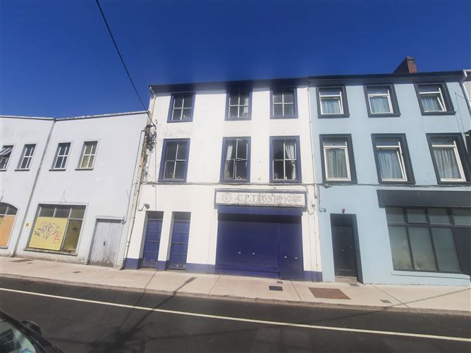 The property comprises a three storey mid-terrace building with plastered elevations under a pitched slate covered roof and offers superb potential as a refurbishment opportunity. The roof pitch is non-symmetrical and there are differing floor levels on the east and west sides of the main building. The building benefits from three access points directly from the public footpath providing for separate access to the upper floors. There is also a two storey extension to the rear of the main building which is likely to be of concrete block construction with plastered elevations supporting a flat asphalt covered roof. Internally the building accommodates a vacant retail unit and stores at ground floor, two occupied residential flats at first floor presently generating a rent of €15,600 p.a. and vacant stores at second floor.