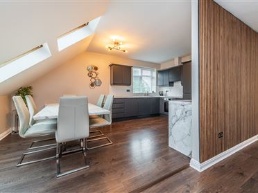 First floor apartment comprising of entrance hall with storage area and hotpress, large open plan sitting room/dining/kitchen area with plenty of natural light, two double bedrooms, bathroom and storage area. It is conveniently located in a delightful village where an array of amenities are readily available including shops, primary school, church, pubs and a variety of sports and recreational facilities. Commuting to Dublin city and its surrounding areas is very convenient via a frequent daily bus service and easy access to the M4 and M7 motorways.