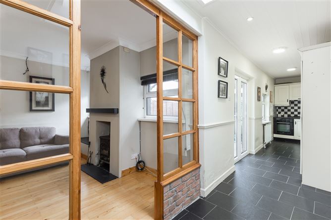 With laminate flooring, back boiler stove, rear windows and feature glass wall leading into kitchen area.