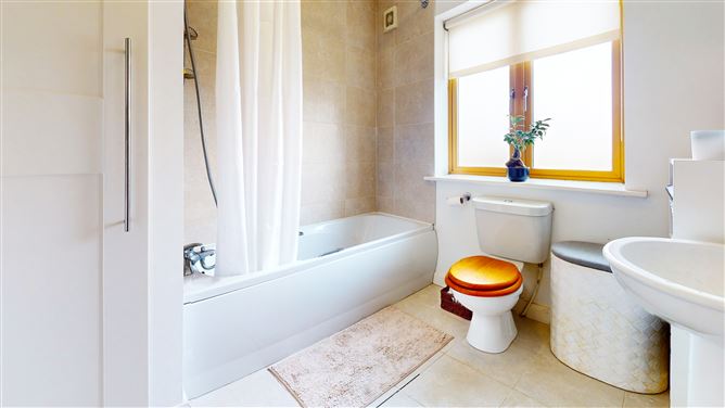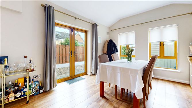ACCOMMODATION (Ground Floor) Entrance hall with wood floor, radiator cabinet, guest w.c., w.h.b., tiled floor Living room with feature fireplace, wood birning stove, wood floor, curtaines, blinds, t.v. point, radiator cabinet Kitchen with fully fitted wall/floor units, spacious worktop area, oven/hob/extractor fan, tiled floor to kitchen area and wood floor to dining area, island with drawers and presses, double doors leading to:- Sun room / dining room wood floor, radiator cabinet, lots of natural light, double doors opening onto the rear patio area. ACCOMMODATION (First Floor) Bedroom (1) with quality built-in wardrobes with mirror inset, drawers En-suite with w.c., w.h.b., shower cubicle, tiled floor, partly tiled walls Bedroom (2) with quality built-in wardrobes, shelving Bedroom (3) with built-in wardrobes Bathroom with w.c., w.h.b., bath, tiled floor and partly tiled walls, extractor fan Attic Conversion with Velux windows, storage presses and eaves storage OUTSIDE Walled / fenced garden at the rear, pation area with some grass, barna shed, rear access from parking area.
