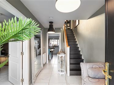 This spacious home features a bright open-plan kitchen/dining room, a separate utility room, guest W.C. and a welcoming living room with double doors connecting the ground-floor accommodation. Patio doors from the dining area open onto a large, private, low-maintenance rear garden complete with a wide side entrance, wooden decking area, garden shed, and outdoor tap?ideal for entertaining or family relaxation.