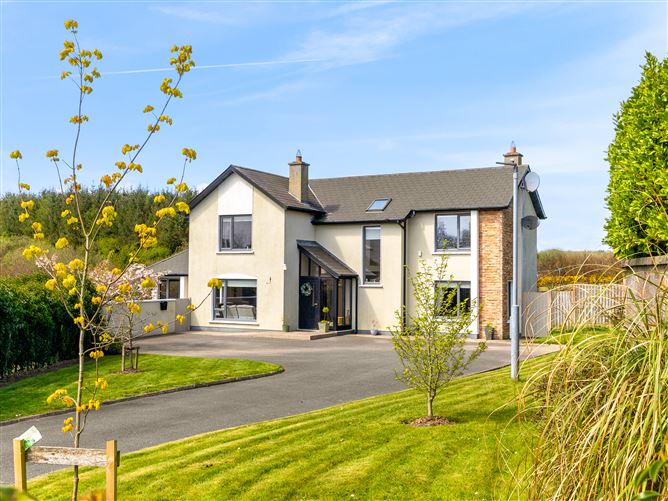 Presenting an extremely impressive, turnkey detached Two-Storey Residence with Exceptional Finishes and amazing Countryside Views, very rare to come to the market in such an excellent, upgraded presentation. A premium property with luxurious finishes. This beautifully presented most handsome detached home extends to approximately 195 sq. m. (2,100 sq. ft.) and offers a superb blend of modern comfort, energy efficiency, and stylish interior design. Boasting a strong B2 energy rating, the property benefits from high-performance features including triple-glazed Senator windows, fibre broadband connectivity, and solar panels for water heating, new Darren Langrell Kitchen, new upgraded/renovated bathrooms. Resting on a large site of c. 0.55 acres approx. with stunning views of the surrounding countryside. Accommodation The accommodation is thoughtfully designed for modern family living, with a bright and spacious entrance porch and hallway tiled with beautiful open carpeted staircase leading to first floor, an open-plan kitchen, dining and living area forming the heart of the home this area is a fabulous space with lots of light from picture perfect window and array of triple glazing , solid fuel stove opens to kitchen - the bespoke Darren Langrell kitchen is finished in an elegant French grey with granite worktops and a central breakfast island, complemented by a charming window seat. This space flows seamlessly into a large and impressive sunroom, complete with French sliding doors opening onto the rear/side garden—perfect for both relaxing and entertaining. A very useful utility room with fitted presses leads to rear door access with a picture-perfect rear door with a view! The main reception room features dual aspect windows, carpeting, fitted media wall units and open fire. The first of four spacious double bedrooms is located on the ground floor, wc/whb just off entrance hall. Upstairs, the principal bedroom suite is finished to an exacting standard with plush carpeting, decorative panelling, and a pocket door leading to a spacious walk-in wardrobe. A luxurious newly renovated en-suite features state-of-the-art bathroom fittings, including a bath and a pumped power shower with rain head. A newly remodelled main bathroom also offers excellent presentation, featuring a double shower and built-in storage. Bedroom three and four on this level are of very good dimensions with ample room for double/king sized beds. Garden No 3 Wheatfields is nestled in a private leafy enclave of 5 detached properties extremely private from each other. Nestled privately on c 0.55 acre, approached via tarmac driveway with ample parking, lush green lawn flanking. The property enjoys stunning countryside views to the rear, enhancing the sense of space and tranquillity throughout. The grounds are further enhanced by an impressive, paved patio area in porcelain slabs, ideal for outdoor dining and enjoying the surrounding scenery. This impressive patio wraps around the property with sunken planters. The garden is abounded by mature shrubs, trees and is fully fenced/gates each side providing ideal security for children or pets. Location Located north of Enniscorthy town and close proximity to Oulart village. Only minutes’ drive from the M11 motorway Rosslare to Dublin. Included Belling double electric oven with gas hob, dishwasher, American fridge freezer, washing machine and tumble dryer, blinds (recent Darcy Blinds some blackout), Curtains, Barna sheds. Size 195 sq. meters 2100 square feet approx. Services Gas-fired central heating, Private well with water filtration system, Communal sewerage/treatment system Management company in place (approx. €100 per month) covering public liability, lighting, and maintenance of common areas, Solar panels for hot water. Fibre broadband availability. This is a rare opportunity to acquire a turnkey home of exceptional quality in a peaceful countryside setting. BER B2 BER No: 105678460 11.72 kWh/m²/yr Directions Y21 DX99 From enniscorthy proceed over Old Bridge turn left along the R744 continue or 3.5 km proceed through roundabout 2nd exit , proceed for 4.3 km, turn left on The Moate 300 meters turn right 190metres Turn left into Wheatfields , sign on property .