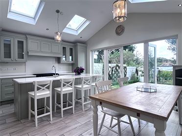 Entrance porch: 195m x 0.61m Sliding door, tiled flooring. Entrance hall: 4.89m x 1.72m. Coving, understairs storage. Living room: 4.52m x 3.37m. Feature fireplace. Dining/Family room: 5.26m x 3.49m. Door to West facing rear garden. Kitchen: 2.98m x 2.37m. Fitted wall and floor unites, integrated oven, hob, fridge/freezer, plumbed for dishwasher, extractor fan, recessed lighting. Guest WC: 1.35m x 0.71m. Tiled flooring, WC, Whb. Landing: 3.46m x 1.96m. Attic access, hot press. Bathroom: 1.92m x 1.64m. Fully tiled walls & flooring, bath with Triton Shower, WC, Whb. Bedroom (1): 3.22m x 3.47m. including wardrobes. Double fitted wardrobes. Bedroom (2): 3.21m x 4.52m. Double fitted wardrobes. Bedroom (3): 2.70m x 2.38m. Fitted wardrobes. Gardens. Side access to mature West facing rear garden with concrete shed. Off street parking and landscaped gardens to the front.