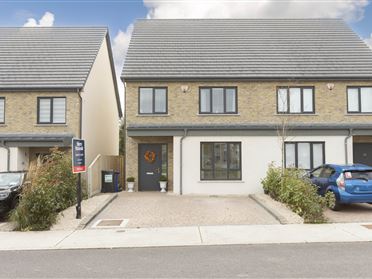 Presented in exceptional condition throughout, this three-bedroom semi-detached family home combines contemporary style, high-quality finishes, and a prime location in one of Mullingar’s most desirable residential developments. Ideally situated in the prestigious low-density development of Glenmore Wood — comprising just 148 homes — this property enjoys a peaceful setting on the Dublin Road side of Mullingar town. With features such as gas-fired central heating, PVC triple-glazed windows and doors, a cobble-lock driveway, and a large, private rear garden with shomra. With easy access to the N4 motorway, ensuring excellent connectivity for commuters. A range of amenities are within walking distance, including shops, supermarkets such as Aldi, schools, the regional hospital, and leisure facilities. Bus and train services from Mullingar provide regular links to Dublin and Sligo. The bright and spacious accommodation comprises a welcoming entrance hall with solid wood flooring and coving, leading to a generous sitting room featuring a stylish insert stove, solid wood flooring, and built-in storage. The fully fitted kitchen is complemented by splashback tiling and opens into a dining area with rear garden access, tiled flooring, and elegant panelling. A guest WC completes the ground floor. Upstairs, there are three bedrooms — each with built-in wardrobes and carpet flooring — the primary bedroom with bay windows and a modern en-suite bathroom. The main family bathroom is fully tiled and features a bath, WC, wash hand basin, and heated towel rack. Externally, the home is enhanced by a double cobble-lock driveway to the front and a spacious rear garden. This energy-efficient A3-rated home represents a superb opportunity for any growing family or discerning buyer seeking a turn-key residence in a prime Mullingar location. Viewing is highly recommended to fully appreciate all that this exceptional property has to offer. Accommodation Entrance Hall 0.854m x 5.834m (2'10" x 19'2"): Solid wood floor, coving. Sitting Room 3.496m x 5.244m (11'6" x 17'2"): Solid wood floor, coving, insert stove, built in storage. Kitchen 2.915m x 2.848m (9'7" x 9'4"): Tiled floor, splashback tiling, fully fitted kitchen. Dining Area 5.372m x 3.822m (17'7" x 12'6"): Rear door access, tiled floor, panelling. Guest WC 1.928m x 1.350m (6'4" x 4'5"): Tiled, wooden panelling, WC, WHB. Bedroom One 4.112m x 2.879m (13'6" x 9'5"): Carpet flooring, bay windows, built in wardrobe. En-Suite 2.126m x 2.334m (7' x 7'8"): Wash hand basin, WC, tiled throughout, heated towel rack, shower, velux window. Bedroom Two 3.346m x 2.827m (11' x 9'3"): Carpet floor, integrated wardrobe. Bedroom Three 2.435m x 2.932m (8' x 9'7"): Carpet flooring, built in wardrobes. Bathroom 2.613m x 1.881m (8'7" x 6'2"): Heated towel rack, tiled floor, bath tub, WC, wash hand basin Special Features & Services • Exceptional decor • GFCH • PVC triple glazed windows & doors • Double cobble lock drive • Prime location • Family estate • Mature garden • South facing garden • Easy access to N4 • Close to local schools • Walking distance to Mullingar town • Ideal family home • Close to Aldi store • Shomra to rear, insulated, heating and internal and external lighting • Solar Panels • EV charging port. BER BER A3, BER No. 109762450