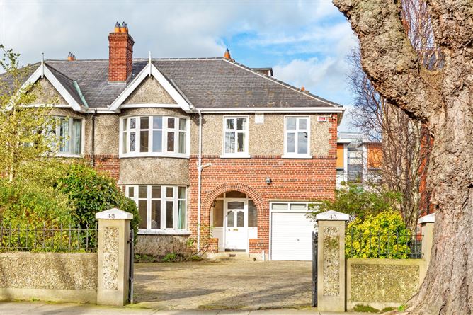 DNG Donnybrook are delighted to present 43 Eglinton Road, Donnybrook, Dublin 4 to the market. This superb property has been very well maintained over the years and although in need of some modernisation it offers excellent scope for further expansion if so desired. Light filled, spacious and versatile accommodation, extending to 2449 sq ft ( including garage) plus an addition 108sq ft in the cellar (approx.), and attic (220 sq ft)offer a perfect balance of reception rooms and generous bedrooms. Living accommodation briefly comprises of a large welcoming entrance hallway with guest wc and under stairs storage, reception room one to the front of the property with large feature bay window, original interconnecting double doors leading to reception room two with door leading to sunroom / conservatory which overlooks the rear garden. Family room leading to kitchen and breakfast room which both overlook the rear garden. Upstairs at first floor level, there are five generously proportioned bedrooms and a very large family bathroom, access to two attic rooms currently used as storage and home office. Outside the rear garden is an ideal size for family entertainment and al fresco dining mainly laid to lawn and fully walled. The front of the garden is cobble locked offering secure off-street parking for up to five cars. The property is further complimented by having a garage which is accessed via the front of the property and the side of the property. The side of the property is mainly enclosed offering ideal storage solutions for the growing family, it has plumbing for a washing machine and dryer. Superbly positioned at the Donnybrook end of Eglinton Road the property benefits from an exceptionally convenient location being within minutes' walk of the extensive amenities of Donnybrook and Ranelagh, which include some of Dublin's premier restaurants and specialty shops, boutiques, gastro pubs etc. Also located close by are many of the city's premier primary and secondary schools such as St Mary's National School, Muckross Park, Gonzaga College, St. Michaels College, The Teresian School and Sandford Park to name but a few. Within easy reach are an excellent selection of sports clubs such as David Lloyd (Riverview) Sports Centre, Donnybrook Tennis Club, Leinster Rugby grounds at the RDS, Merrion Cricket grounds and the AVIVA Stadium. Register your interest quickly as interest in the fine family home in the very heart of Dublin 4 is sure to be strong.