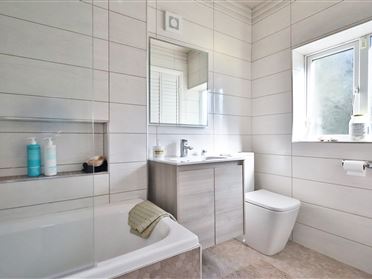 Entrance Hall 20'4" x 6'0" With wood effect tiled flooring and composite front door with glass panel insert. Lounge 15'6" x 11'6" With wood effect tiled flooring, built in media unit, acoustic paneling and TV point. Kitchen/Dining Room 17'9" x 15'0" With wood effect tiled flooring, built in wall to floor units, laminate worktop, oven, hob, extractor fan, integrated dishwasher, stainless-steel sink and french doors to rear garden. Utility Room 6'8" x 5'0" With wood effect tiled flooring, built in floor units and laminate worktop. W.C. 5'0" x 4'11" With tiled flooring, w.h.b and w.c. Landing With carpet and hotpress Bedroom 1 14'8" x 10'4" With carpet and built in wardrobe. Ensuite 6'6" x 4'10" With tiled flooring and partially tiled walls, shower, w.h.b and w.c. Bedroom 2 12'3" x 9'9" With carpet and built in wardrobe. Bedroom 3 12'3" x 7'8" With carpet and built in wardrobe. Bedroom 4 10'3" x 7'1" With carpet. Bathroom 6'2" x 5'10" With tiled flooring, partially tiled walls, bath, w.h.b and w.c.