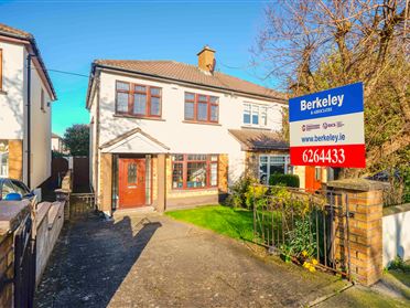 Berkeley & Associates are delighted to present No. 86 Glenmaroon Road, Palmerstown to the market. This thoughtfully decorated, semi-detached family home is well-nestled in the heart of old Palmerstown and is certain to attract lots of interest from the discerning purchaser. The property boasts generous living spaces, with approximately 950sq.ft. of interior living accommodation comprising a large porch to the front, leading to both front door and also to side entrance with lean-to roof, entrance hallway, large and light-filled living room with front aspect and French doors leading to a lovely open plan kitchen/dining area, also with double doors to rear garden and a further door to side entrance. Upstairs we have three well proportioned bedrooms, each with built-in wardrobes and a family bathroom that was recently modernised to a high standard and tastefully decorated with floor-to-ceiling tiles. To the front of the property there is a long driveway offering an abundance of off-street parking, adjacent to a picturesque lawn full of various trees and hedging. To the rear, this striking family home boasts a very long and private walled garden with double doors from the dining room leading to a patio, and both a concrete block shed and wooden shed at the end of the sizeable plot. The side entrance at No. 86 also offers serious potential for the prospective purchaser to further extend this wonderful property. Glenmaroon Road is an enviable, tree lined enclave that is never short of demand due to its prime location just off the N4 whereby it offers convenient access to the M50/M4/M7 road networks and boasts close proximity to every conceivable amenity. At the same time it is a quiet, mature road that provides haven from all around it. There is an entrance to Glenaulin Park at the end of the road, Palmerstown Shopping Centre, Liffey Valley Shopping Centre and The Phoenix Park are all within touching distance and you are approx. 9 kilometres from the heart of the city. Overall, this gem in old Palmerstown offers a fantastic opportunity and viewing is highly advised.