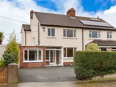 Ground Floor Entrance Hall 6.30m x 2.50m (20’8” x 8’2”) Solid oak floor, curved feature wall, cloakroom with overhead storage, two feature stained glass windows, radiator cover, spotlights, glazed double doors into the: Inner Reception Hall 5.00m x 5.00m (16’5” x 16’5”) Magnificent triple height Reception Hall featuring ornate dentil style plaster cornice and wall cornice, feature fireplace with gas insert, most impressive turned gently sweeping mahogany and cast-iron bespoke staircase with large Velux windows overhead affording maximum natural light. Beautiful bespoke V’Soske Joyce carpet. Drawing Room 5.50m x 5.00m (18’1” x 16’5”) Feature Adams style marble open fireplace, stained glass windows, two sets of French doors, ornate dentil style plaster cornice, bespoke V’Soske Joyce carpet, wall lights, French doors with fanlight above lead into the: Conservatory 4.80m x 4.50m (15’9” x 14’9”) With wraparound windows and beautiful outlook and access to the private walled garden to front. Conservatory with electronic opening roof windows, stone tiled floor, wood paneling, Spotlights, and central light fitting. Sitting Room & Dining Room 9.00m x 4.50m (29’6” x 14’9”) (overall). Adams style marble fireplace, radiator cover, wall lights, stained glass window, bespoke V’Soske Joyce carpet, solid oak wood floor, conservatory style bay windows and roof light, door to rear garden and door into: Kitchen / Breakfast Room 6.00m x 4.75m (19’8” x 15’7”) With a tiled Travertine marble floor, custom made Dalkey Design solid oak kitchen with hand painted centre island unit complete with Silestone counter tops. High quality appliances to include Sub Zero fridge, Fisher and Paykel double dish drawer dishwasher, Neff single oven, Neff microwave, gas fired Aga, stainless steel sink with swan neck tap, Neff ceramic hob, spotlights, French patio doors and window overlooking the rear garden. Inner Hallway 3.70m x 1.60m (12’2” x 5’3”) With oak wood floor and closet used for appliances. Utility Room 1.60m x 3.80m (5’3” x 12’6”) With Travertine marble tiled floor, Belfast sink, window to rear, Velux, plumbed for washing machine and space for dryer. Access to: Plant Room 1.80m x 2.40m (5’11” x 7’10”) With Travertine marble tiled floor, two gas boilers - Ideal Logic boiler and Glow Worm boiler. Guest W.C. With tiled floor, tiled shower enclosure with pumped shower, fitted Finnish Sauna, Villeroy and Boch wash hand-basin, Villeroy and Boch w.c., pumped shower, spotlights, and window. Study 3.10m x 5.00m (10’2” x 16’5”) Bespoke Oakline desk and bookcase, spotlights, ceiling coving, window to both side and front, solid oak wood floor. Access to entrance hall to front. First Floor Landing Primary Bedroom 4.40m x 4.80m (14’5” x 15’9”) Three floor to ceiling wardrobes offering ample storage, pleasant outlook to the rear, wall lights, spotlights, coving, door to: Ensuite 3.50m x 2.00m (11’6” x 6’7”) With porcelain tiled walls and floor, pumped shower with body jets, heated towel rail, dual windows, Villeroy and Boch w.c., Villeroy and Boch twin sinks, twin mirrors above, spotlights and Velux window. Family Bathroom 2.40m x 3.60m (7’10” x 11’10”) Villeroy and Boch w.c, freestanding bath, wall mounted taps, tiled recessed shelving, walk in tiled shower with pumped rain head shower with hose attachment, contemporary porcelain sink with storage beneath, wall hung Villeroy and Boch W.C. with wall flush, spotlights, window to rear, heated towel rail, extractor fan, porcelain tiled floor and walls. Bedroom 2 3.90m x 3.60m (12’10” x 11’10”) Fitted wardrobes and shelving, vanity unit with wash-hand basin. Bedroom 3 5.00m x 3.10m (16’5” x 10’2”) Wooden floor, built in desk, built in vanity unit, built-in wardrobes, spotlight. Bedroom 4 3.10m x 5.00m (10’2” x 16’5”) Spotlights, built-in wardrobes, door to: Ensuite With w.c, wash hand-basin and towel rail. Luggage Room Understairs storage. Library / Home office Bespoke custom-made solid wood Oakline library shelving with computer desk. Bedroom 5 3.20m x 4.90m (10’6” x 16’1”) Plumbed vanity unit, built-in wardrobe, built-in desk, spotlights, window to front. Large Hot-press Second Floor Landing With feature large picture window to the front, 2 Velux windows overhead. Shower Room Villeroy and Boch sink and vanity, w.c, tiled floor and walls, skylights, electric heated towel rail, recessed shelving, door to storeroom. Home Office 3.80m x 4.70m (12’6” x 15’5”) With two Velux windows, spotlights, built-in wardrobe and desk. Den/Playroom 3.80m x 4.70m (12’6” x 15’5”) With built-in wardrobe. Velux window. Family Room 4.70m x 7.00m (15’5” x 23’) With wooden floor, solid wood Kingstar stove and marble hearth, window to front, two Velux window, doors to two storage rooms, feature double height ceiling. Stairs leading up to the: Mezzanine 4.10m x 3.30m (13’5” x 10’10”) With Velux window, door to under eaves storage.